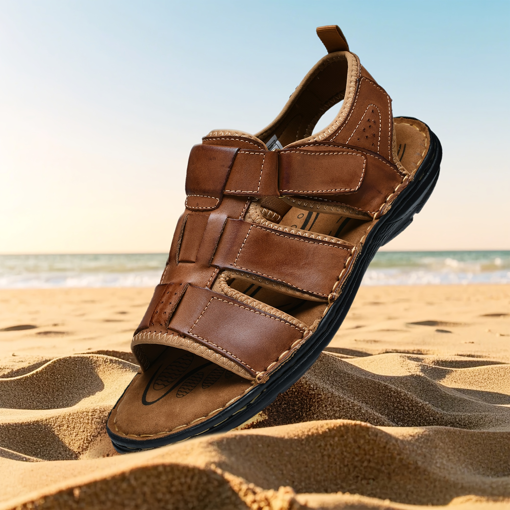 Men'S Genuine Leather Sandals - Classic Open-Toe Summer Beach Shoes with Adjustable Hook & Loop Strap, Non-Slip PVC Sole for Casual, Water Sports & Daily Wear, Strappy Sandals