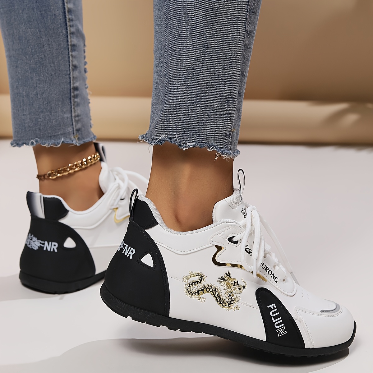 Women'S Comfortable Casual Sneakers - Stylish Black & Golden Dragon Design, Breathable Fabric & Synthetic Upper, Durable Rubber Sole, Lace-Up Low-Top Running Shoes for All-Season Wear, Ladies Sneakers