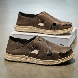 Men's Solid Color Close Toe Sandals, Comfy Non Slip Split Cow Leather Upper Rubber Sole Walking Shoes, Men's Summer Footwear