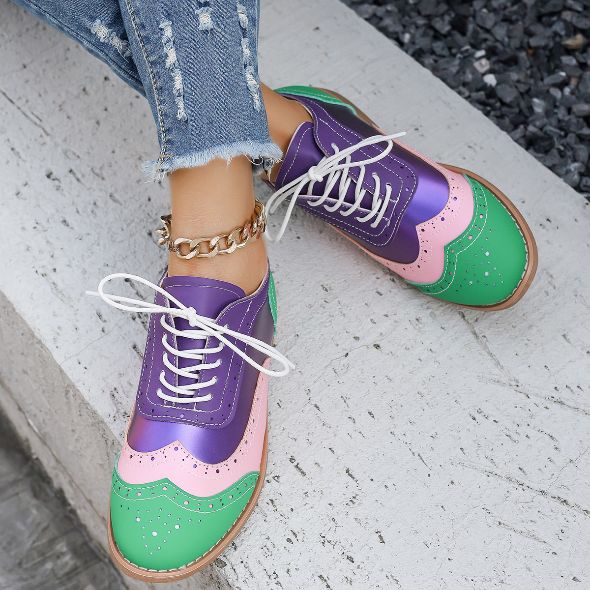 Women's Large Size Brogue Lace-Up Shoes - Vibrant Purple/Pink/Green/Black/Golden/Blue/Pinkish-Purple/Greenish-Purple, Round Toe Low-Top Ankle Boots with PU/PVC Sole, All-Season Casual & Formal Dress Shoes for Everyday & Special Occasions, Comfortable & Durable with EVA/Rubber Insole, PVC Lining, and Stylish Brogue Detailing for a Chic Look, Extra Wide Width Shoes for Women, Womens Casual Sneakers, Wide Fit Shoes for Women Plus Size, Coloured Sneakers for Women,